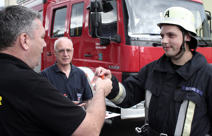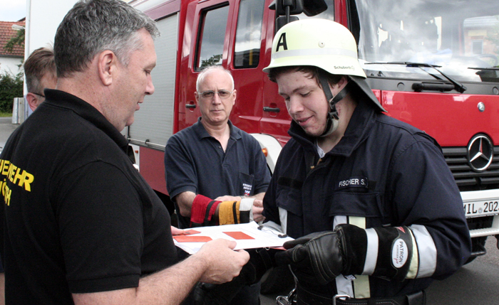 Angenommen war ein Brandeinsatz, zu dem die Feuerwehrleute den Gruppenaufbau mit Brandbekämpfung unter Atemschutz, Löschwasserversorgung, Löschwasserentnahme und Verkehrsabsicherung durchführen müssen. Für das alles dürfen sie nicht länger als 300 Sekunden benötigen. Zuvor fragten die Prüfer mit den Zusatzaufgaben Grundwissen aus den Bereichen Gerätekunde, Knotenkunde, Erste Hilfe und Gefahrgut-/Hinweisschilder ab. Abgeschlossen wird die Leistungsprüfung mit dem Saugschlauchkuppeln und auch diese Aufgabe meisterten Obernburgs Blaukittel mit Bravour.