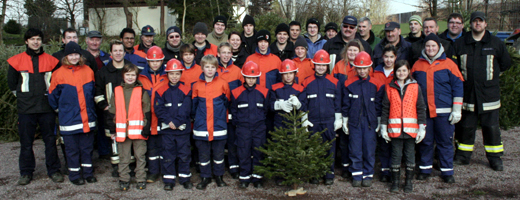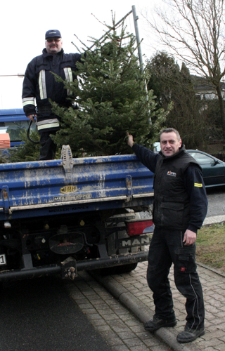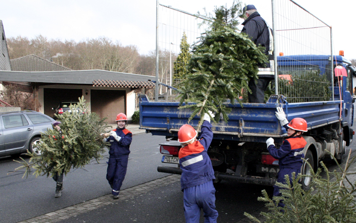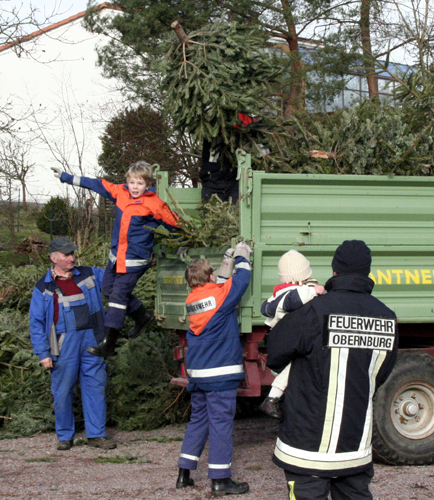 37 Feuerwehrfrauen und -männer sammelten am sonnigen Samstag, den 14.01.2012, die von der Bevölkerung auf die Straße gestellten Christbäume ein. Dabei teilen sich die Blaukittel in vier Gruppen auf und zogen, begleitet von Traktoren und LKWs durch die Straßen. Binnen drei Stunden häufte sich auf der Freifläche der ehemaligen Tennisplätze unterhalb der Frühlingsstraße ein riesiger Berg aus Fichten und Tannen. Nach vollbrachter Arbeit stärkten sich die fleißigen Helfer mit Leberkäse und Brötchen. Kommandant Martin Spilger und Vereinsvorsitzender Heiko Amrhein dankten den fleißigen Helfern. Ein Dank geht an die Mitglieder Stefan Stahl, Robert Schmitt, Ludwig Vad, Helmut Vad und Erich Reis, die den Abtransport mit eigenen Fahrzeugen unterstützt haben. Besonders freuten sich die Jugendlichen der Feuerwehr Obernburg über die Spenden und Geschenke aus der Bevölkerung. Zahlreiche Bäume waren mit einer kleinen Aufmerksamkeit behangen.