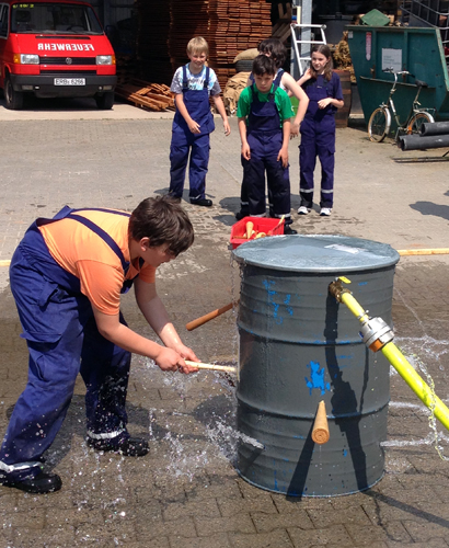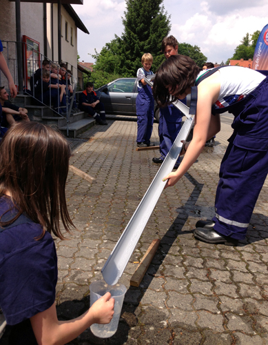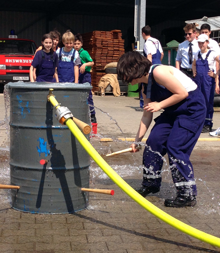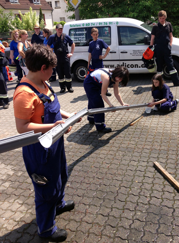 Die einzelnen Stationen waren in halb Mömlingen verteilt und die Jugendlichen mussten sich mit Hilfe einer Karte orientieren, um diese zu finden. Es mussten Ringe geworfen werden, um Punkte zu sammeln. Wasser musste durch einen Schlauch in einen Eimer transportiert werden, dabei wurde der Wasserstand im Eimer gemessen und in Punkte umgerechnet. Eine weitere Station war das Fass. Dieses wurde mit Hilfe von Wasser unter Druck gesetzt und es mussten zuerst Holzstücke aus den Löchern gezogen werden und danach wieder in die richtigen Löcher gesteckt werden. Desto weniger Wasser zum Schluss noch aus den Löchern rann, desto mehr Punkte wurden aufgeschrieben. Schläucheflechten war eine weitere Station der Wettspiele, dabei mussten drei C-Schläuche innerhalb von zwei Minuten so weit wie möglich geflochten werden, um Punkte zu sammeln. Dabei stellte sich gerade die Jugendgruppe U18 sehr geschickt an, denn sie schafften 30 Windungen, wobei es schon bei 20 die Höchstpunktzahl von 100 Punkten gab. Das Kistenlaufen was für manche Mannschaften sehr schwierig. Denn dabei mussten 5 Teilnehmer auf 3 Kisten steigen und sich auch noch von A nach B bewegen. Verschiedenste Techniken wurden ausgetestet und es gelang dann doch den meisten, sich vorwärts zu bewegen.
