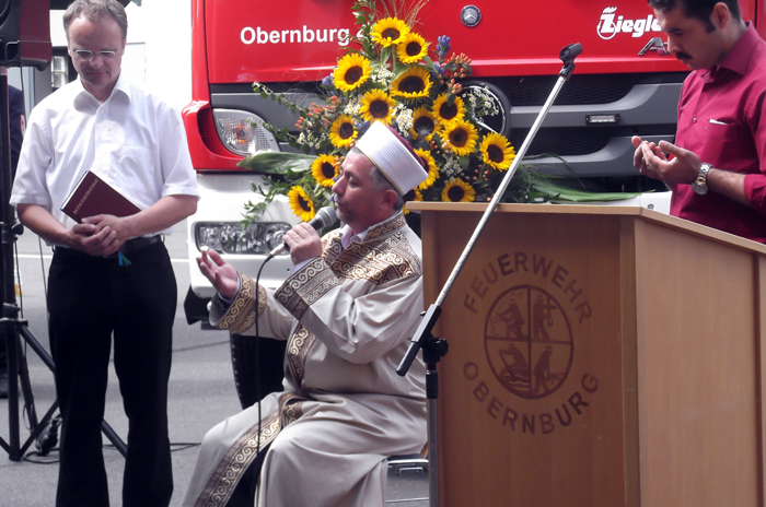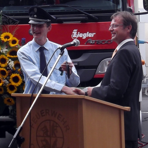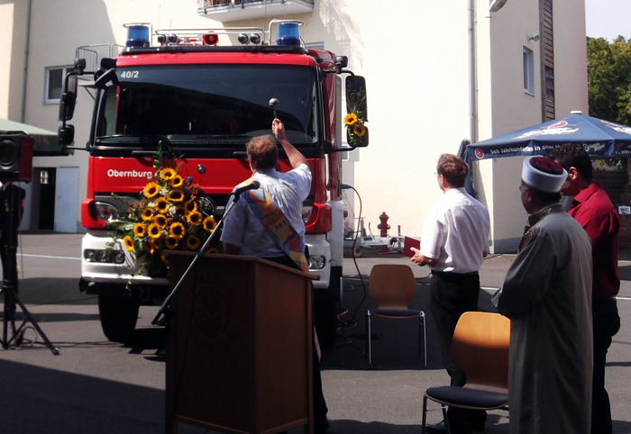 Bürgermeister Dietmar Fieger eröffnete die Veranstaltung am Feuerwehrgerätehaus und Diakon Martin Höfer, Pfarrer Gregor Kreile, sowie Imam Mehmet Demirtas ließen dem Neufahrzeug den kirchlichen Segen zuteil werden. Zur Schlüsselübergabe an Kommandant Martin Spilger wünschte Fieger den Feuerwehrleuten stets erfolgreiche Einsätze und gute Heimkehr.