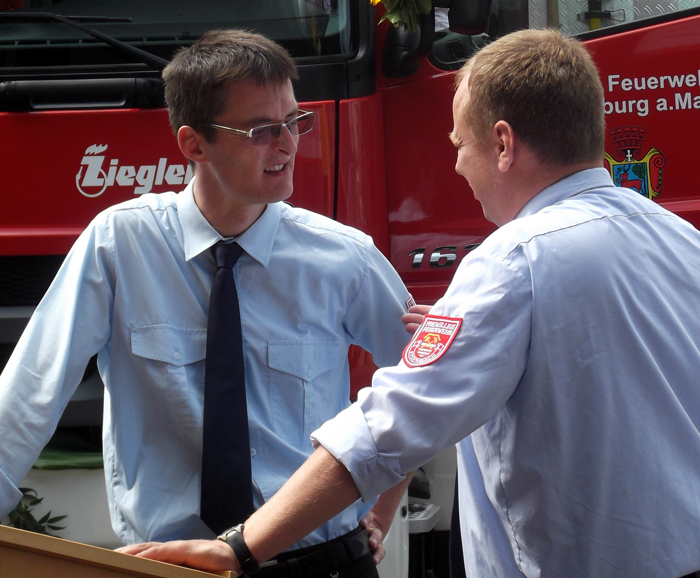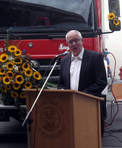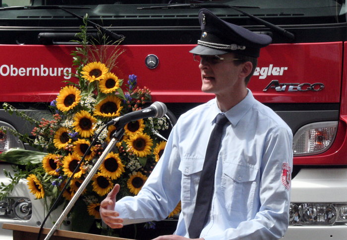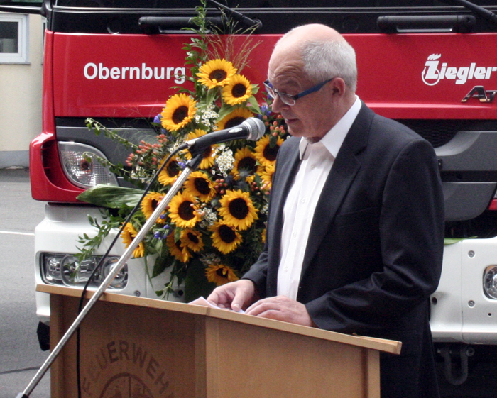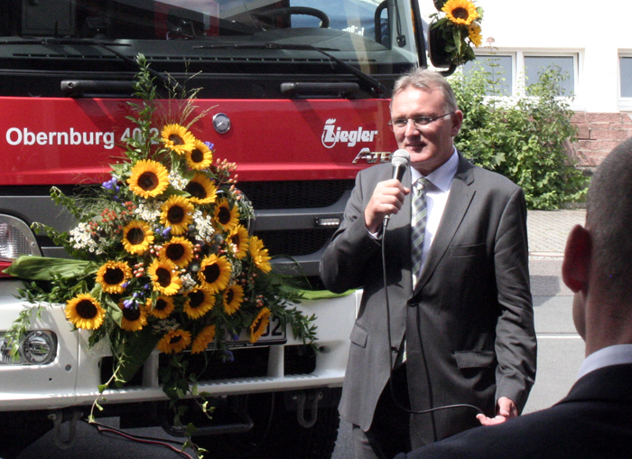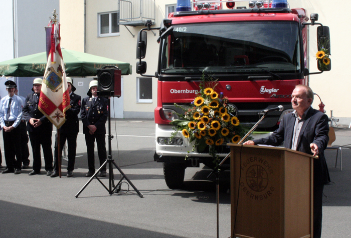 Vor knapp 150 geladenen Gästen übergab am Sonntag, den 10.08.2014 Bürgermeister Dietmar Fieger an Martin Spilger, Kommandant der Feuerwehr Obernburg, ein nagelneues Löschfahrzeug LF20. Die Beschaffung resultiert aus dem Fahrzeugkonzept des Feuerwehrbedarfsplanes von 2008. Demnach ersetzt es die altgedienten Fahrzeuge, das TLF 26/25 und das LF 8.