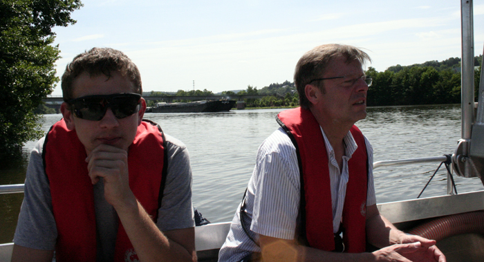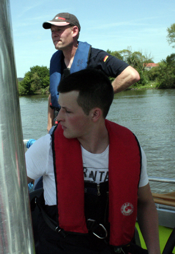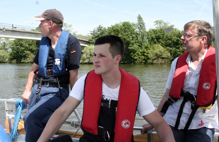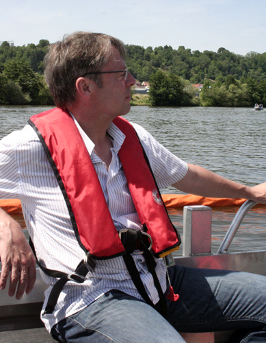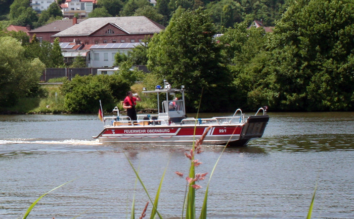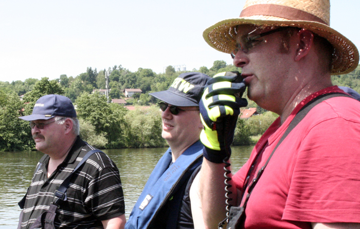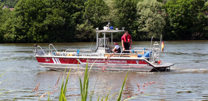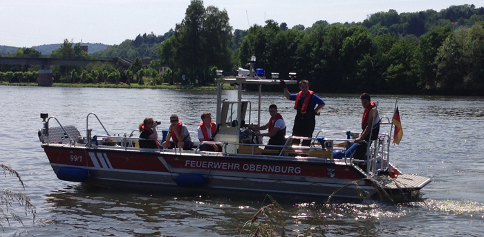 Bürgermeister Dietmar Fieger überzeugte sich persönlich vom guten Ausbildungsstand seiner Feuerwehr , sowie des THW am Standort Obernburg, und ließ es sich nicht nehmen, beim Einsatz des Bandskimmers mit an Bord zu gehen. Kommandant Martin Spilger zeigte sich erfreut über den guten Übungsablauf und sprach noch einen Vorfall aus dem Vorjahr an. Im August 2013 blieb der ehemalige Bootstrailer der Feuerwehr Obernburg auf dem Weg zur Slipanlage liegen und konnte nicht mehr mit einem Zugfahrzeug heimgeschleppt werden. Damals half das THW mit Kran und LKW schnell aus und verbachte das Wasserfahrzeug wieder an den Standort zurück. Spilger bedankte sich an dieser Stelle für die institutionsübergreifende Hilfe.