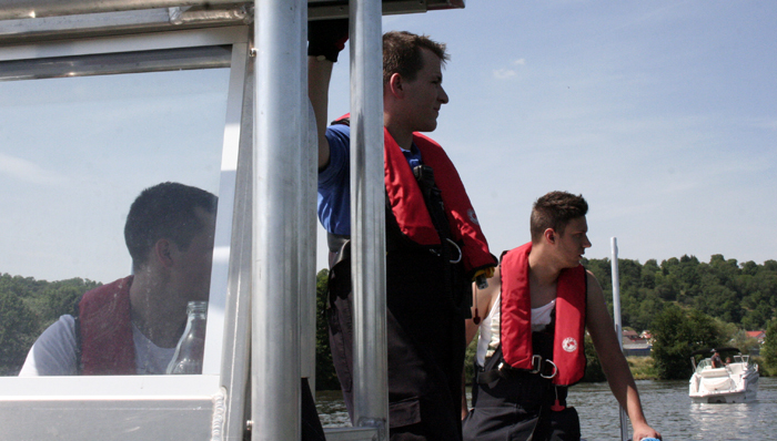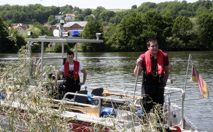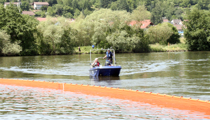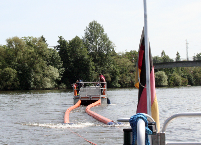 Einsatzmittel beider Institutionen gehören zum Ölwehrstandort Miltenberg und im Schadensfall werden sowohl Feuerwehr als auch THW gemeinsam eingesetzt. Eine gemeinsame Übung hat darum einen besonderen Nährwert und so hatten die Kameraden des THW die Möglichkeit die Ölsperre der Feuerwehr Obernburg zu ziehen. Anschließend zogen die Boote Heros Obernburg 99/1 und Florian Obernburg 99/1 den Bandskimmer und übten dessen Einsatz. Dabei sind die Bootsführer besonders gefordert, denn damit der Skimmer effektiv arbeiten und Öl von der Wasseroberflache abschöpfen kann, sind aufeinander abgestimmte Fahrmanöver und akkurates Fahren sehr wichtig.