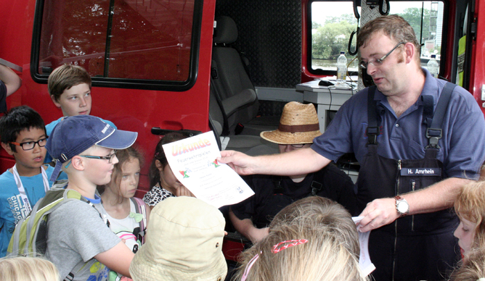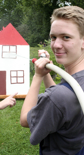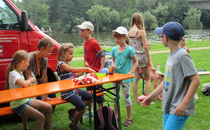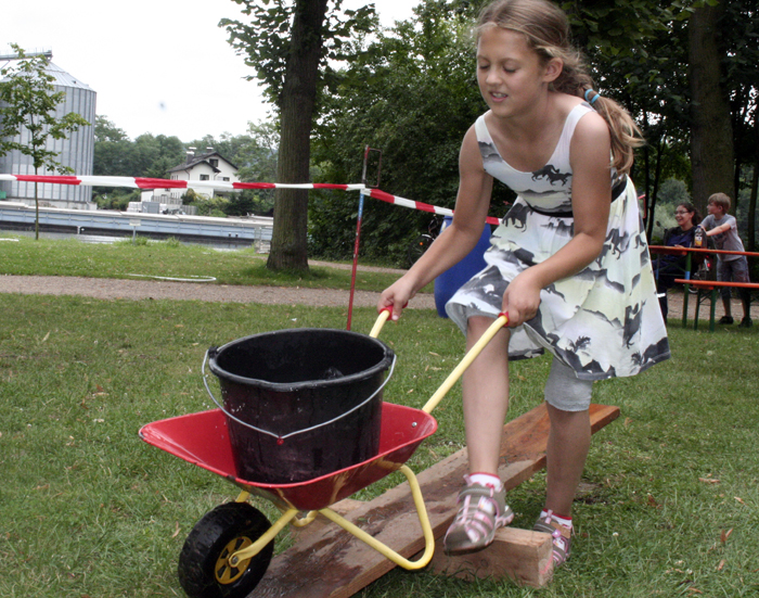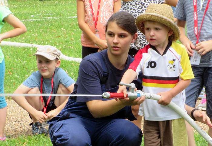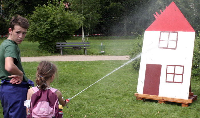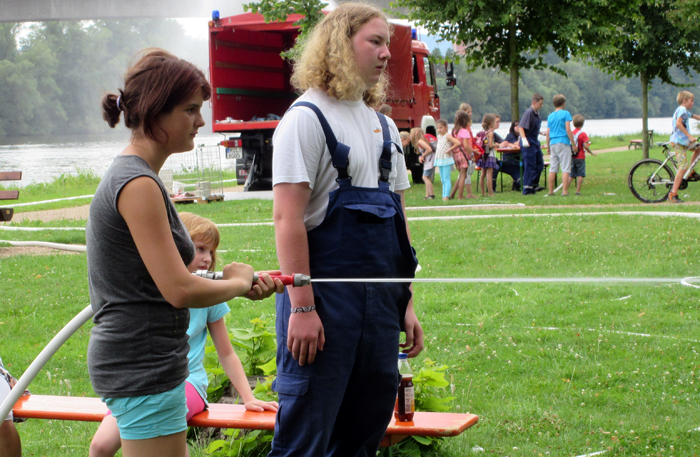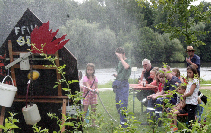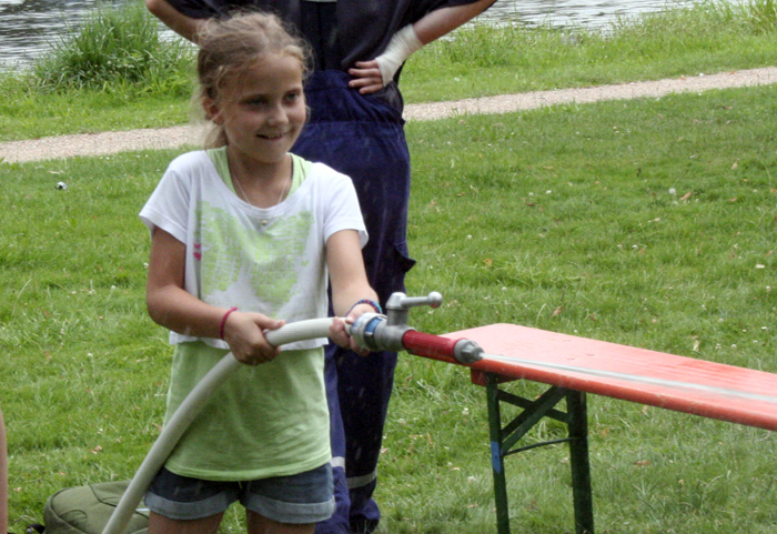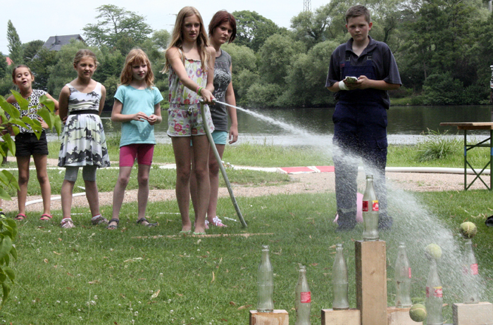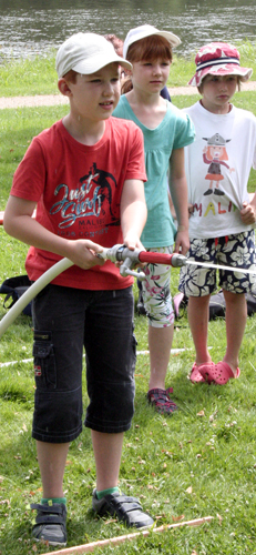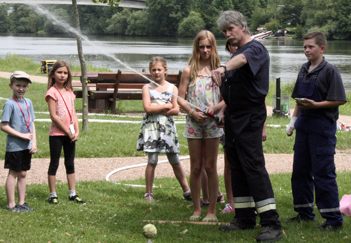 Geschicklichkeitsfahren mit der Schubkarre, Zielspritzen auf Tennisbälle, ein brennendes Haus löschen, Sackhüpfen und der heiße Draht: Das waren die Disziplinen zu den Ferienspielen am Mainufer im Rahmen des Ferienpasses der Stadt Obernburg. 37 Mädchen und Jungen nahmen daran teil und erlebten einen erlebnisreichen Nachmittag am Samstag, den 02.08.2014, gestaltet von der Feuerwehr Obernburg.