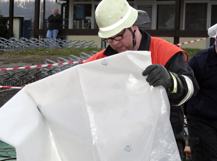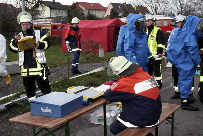 Nach Eintreffen der FF Großwallstadt wurde an der Grenze zum Gefahrenbereich (ca. 60m vom Chlorgasraum entfernt) die Not-Dekon aufgebaut. Die Notdekon war um 19:07 Uhr einsatzbereit. Der Dekon-Platz befand sich nördlich zur Gasfreisetzung und damit außerhalb der Gaswolke (sichtbar durch Nebelmaschine.) Zeitgleich rüsteten sich 2 Trupps (je 2 Mann) mit CSA aus. Die beiden CSA-Trupps nahmen die Menschenrettung vor. Die CSA-Überwachung wurde von der FF Großwallstadt übernommen. Desweiteren wurde der Wasserwerfer zum Niederschlagen der Chlorgaswolke durch CSA-Träger vor dem Chlorgasraum in Stellung gebracht und in Betrieb genommen.